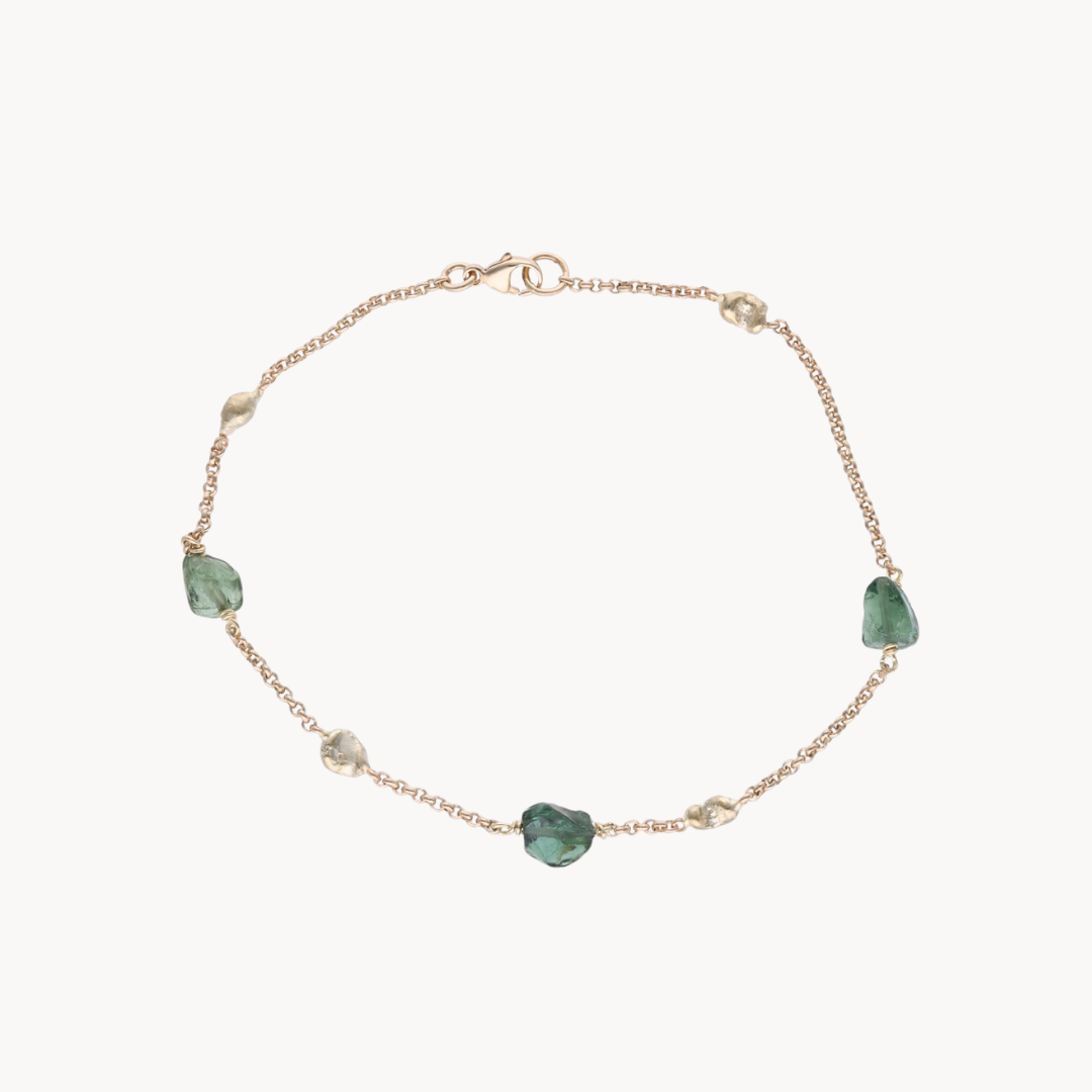Deze 14 krt. geelgouden armband is bezet met toermalijnen in een rijk palet van kleuren, van zachtroze tot frisgroen. De warme glans van het goud laat elke steen prachtig tot zijn recht komen. Een verfijnd en veelzijdig sieraad dat kleur geeft aan elke dag.